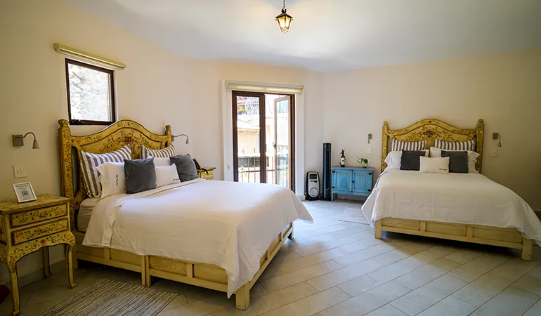 Dos camas Queen Size, baño completo, closet, espacio de trabajo y balcón con vista a la plaza.