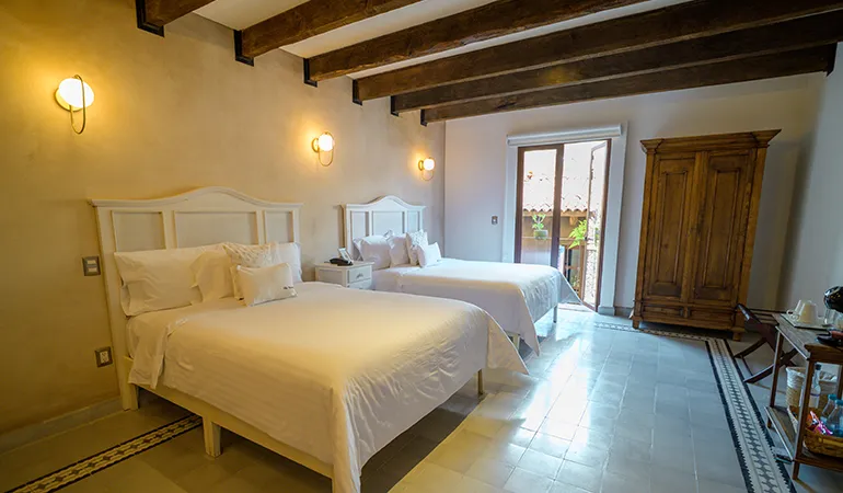 Dos camas Queen Size, baño completo, closet y balcón. Decoración única y mobiliario diseñado a medida.