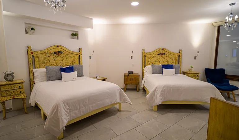 Muy espaciosa y cómoda suite de 62 mts2 en planta baja con amplia terraza para 1 a 4 personas con dos camas Queen Size, baño completo con espejo de vanidad, closet y escritorio. Tendrás una estancia única disfrutando una velada en su terraza con vista al acceso principal de Val’Quirico y lotes residenciales en “Bosques”. Accesible para personas con capacidad diferentes.